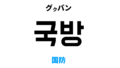 韓国語で国防部 [국방부]の意味と発音を学ぼう スポンサーリンク ㄱ Twitter Facebook はてブ Pocket LINE コピー 2022.12.22 韓国語で国防部は 국방부で、例えは [국방부 공무원, 국방부 관계자] のように使います。このポストでは発音・例文とともに韓国言で国防部の意味と使い方をご説明します。 目次 基本情報국방부意味 基本情報 単語 品詞 漢字 発音 국방부 名詞 國防部 국빵부 국방부意味 意味 解説 こくぼうぶ【国防部】 国土を防衛し、外敵の侵略に備えて、軍事に関する事務を担当する中央行政機関。