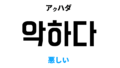 韓国語で悪意 [악의]の意味と発音を学ぼう スポンサーリンク ㅇ Twitter Facebook はてブ Pocket LINE コピー 2022.12.22 韓国語で悪意は 악의で、例えは [악의가 느껴지다, 악의가 없다] のように使います。このポストでは発音・例文とともに韓国言で悪意の意味と使い方をご説明します。 目次 基本情報악의意味 基本情報 単語 品詞 漢字 発音 악의 名詞 惡意 아긔/아기 악의意味 意味 解説 あくい【悪意】。わるぎ【悪気】 悪い心。