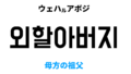韓国語で母方の祖母 [외할머니]の意味と発音を学ぼう スポンサーリンク ㅇ Twitter Facebook はてブ Pocket LINE コピー 2022.12.22 韓国語で母方の祖母は 외할머니で、例えは [외할머니 댁, 외할머니 말씀] のように使います。このポストでは発音・例文とともに韓国言で母方の祖母の意味と使い方をご説明します。 目次 基本情報외할머니意味 基本情報 単語 品詞 漢字 発音 외할머니 名詞 外 할머니 외ː할머니/웨ː할머니 외할머니意味 意味 解説 ははかたのそぼ【母方の祖母】 母の実母を指したり呼ぶ語。